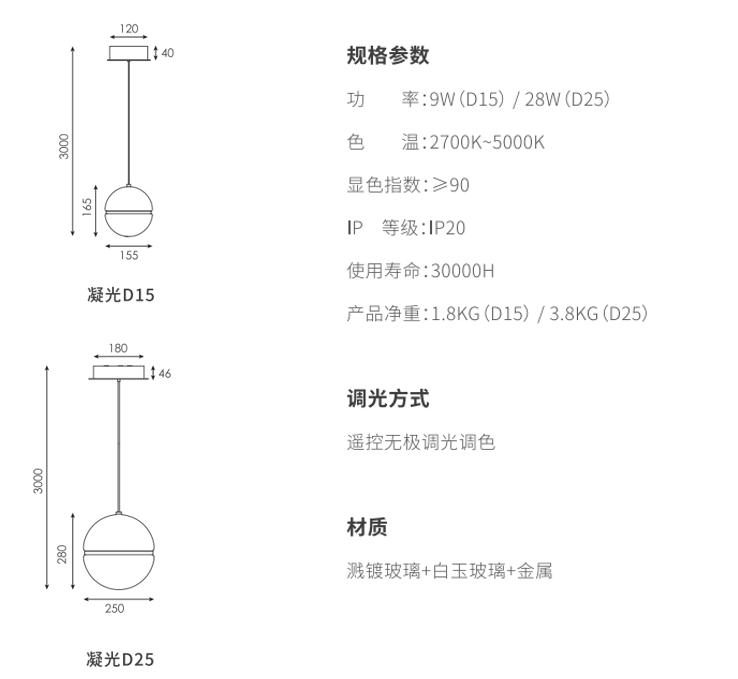 凝光吊灯用双层弯曲的造型作为主要造型特征形成在空间里自由灵动的造型,,以一定的角度倾斜,,,,形成丰富的画面,,,,半圆形等分的灯罩采用白玉料与透明溅镀两种工艺,,,下路利用直下式光学提供充足光线,,,上路则采用测发光方式,,,,发光面透过溅镀的玻璃曲面折射出一个光的倒影。。两种方式组合在一起,,,使其在简单的几何形态中有自己的表达。。