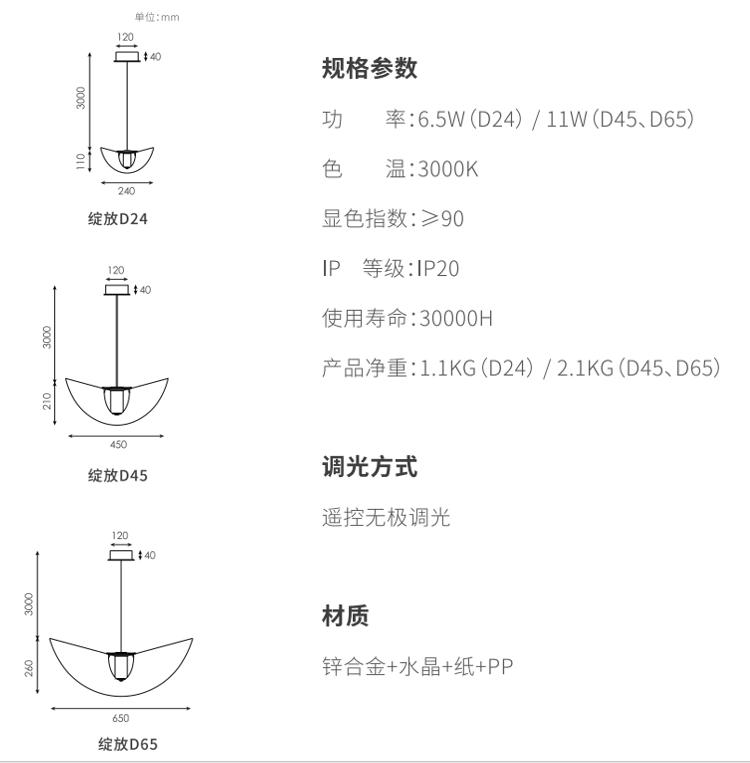 利用材料物理弹性,,,透过巧妙的结构,,,,灯罩在空间里呈现一个富有张力和生机的曲面,,,,仿佛在空间里热烈绽放的花朵,,,灯罩表面采用手工敷纸工艺,,更加的朦胧舒适,,,纸纤维的材质也让灯光更加温柔。。。选用实心高级无铅水晶材质,,这种材料洁净无瑕的透明度与低色散特性,,硬度高,,,,多用于精密光学器件及高端水晶制品,,,更好展现丰富光影质感。。